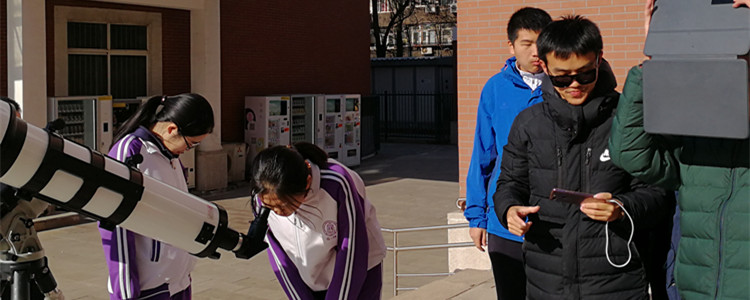 中午12:20分,正值高中上午最后一节课下课。初中部的社员们已经支好了社内最大的望远镜等待日食。此时距离日食开始还有约30分钟。