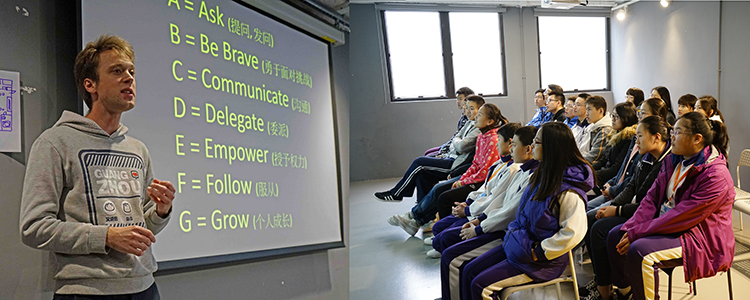 课程主讲师Till介绍领导力课程(左图)学生专注听讲(右图)