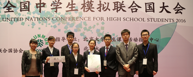 3月27日,2016年度北京大学全国中学生模拟联合国大会在北京大学英杰交流中心闭幕,澳门网上博彩高15级张亦弛、刘昊禹、蒋欣辰、闫淳溪、张奕卓、尹昕儒6名同学组成代表团参加会议,澳门网上博彩模拟联合国指导教师岑逸飞、张悦带队。高1513班张亦弛、高1515班刘昊禹获大会最佳立场文件奖。