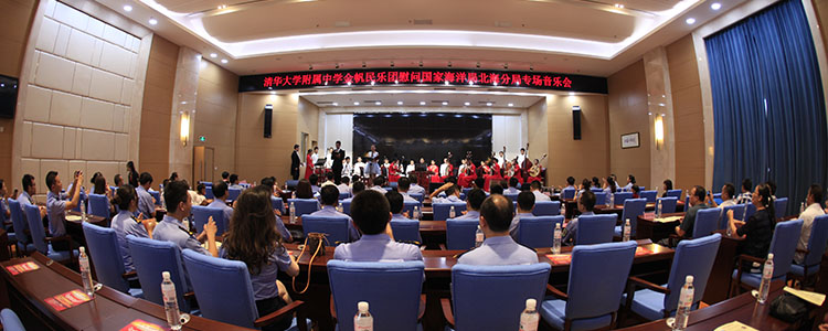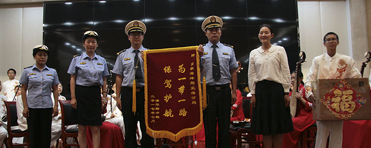 2017年7月21日,澳门网上博彩金帆民乐团一行33名同学,在学生发展中心副主任张国梅和民乐团办公室主任兼指挥胡军老师的带领下,奔赴国家海洋局北海分局,演出了题为《为一带一路保驾护航……澳门博彩在线金帆民乐团慰问国家海洋局北海分局专场音乐会》。此次音乐会由国家海洋局宣传教育中心和国家海洋局北海分局担任指导,由国家海洋局第一海洋研究所和国家深海基地管理中心进行支持,由澳门网上博彩金帆民乐团办公室承办。国家海洋局宣传教育中心副主任朱德洲、国家海洋局北海分局副局长窦月明等300余人观看了音乐会。