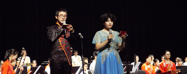 乐团在胡军老师的指挥下,为观众们奉献了描绘节日里喜庆热闹场面的的《庆典序曲》、展现中国国粹精彩的《海岛冰轮初转腾》、赞颂中国少数民族生活的《瑶族舞曲》和极富京腔京韵的《大宅门写意•芦沟晓月》四首中国民乐传统经典作品。赢得了观众们一阵阵热烈的掌声。其中民乐版本的《海岛冰轮初转腾》一曲,原是胡军老师在2011年乐团赴金色大厅演出前,请教了梅葆玖大师后,专为金帆民乐团所作并于2015年在国家大剧院首演的一首乐团保留曲目,由乐团中曾获得“小梅花奖”的王董昱同学在乐团的伴奏下倾情演唱,为观众们展现了中国“非遗”文化的精髓。