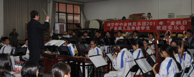 音乐会由胡军老师主持的欢迎仪式开始,之后,胡军老师指挥乐团为日本师生演奏了民乐经典《龙腾虎跃》、《瑶族舞曲》、《丰年祭》等曲目,期间,胡军老师还向来访师生介绍了中国的二胡、琵琶、笛子、唢呐、大鼓、大锣等乐器。
