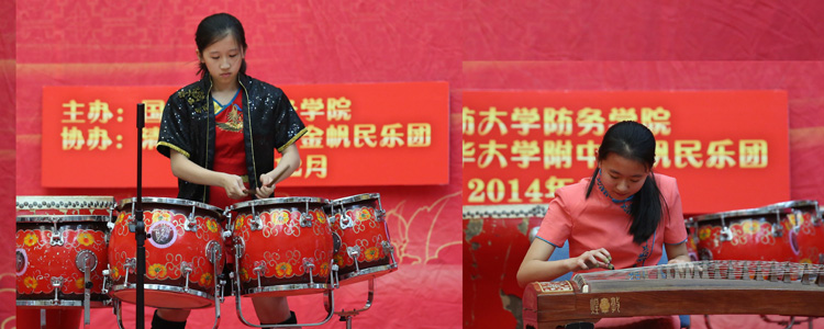 音乐会开场,胡军指挥乐团为外国友人们演奏了《花好月圆》和《瑶族舞曲》两首人们耳熟能详的中国民乐经典力作,同学们精彩的演奏赢得了观众们阵阵热烈的掌声和叫好声。之后,乐团的古筝独奏演员王惠仪同学上场,她为观众们带来了独奏曲《丰收锣鼓》,热烈激昂的曲调从她纤细的指尖流淌出来,引得外军将领们频频拍照录像。乐团的打击乐首席、曾经获得2012年CCTV民乐器乐大奖赛金奖的罗嘉鈺同学,此次为观众们奉献的,是她的获奖作品《楚汉决战》,泼辣的台风、急促的鼓声,把音乐会推向了一个小小的高潮。与乐团多次合作的中国古琴大师杨青携爱徒徐镝清演奏了《梅花三弄》和《酒狂》两首古琴经典名曲,悠扬的古韵,婉转的情怀,让人仿佛穿越了时空,近距离地接触到了中华古韵的魅力。