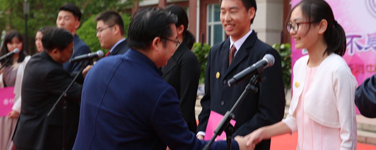 在热血沸腾的诗朗诵之后,全体校领导走上舞台,为学生代表亲自佩戴纪念徽章。金色的徽章反射着金光,纪念着金色的青春年华,寄托着人人心中金色的未来。