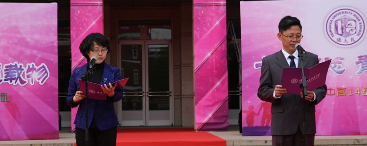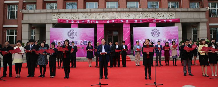 下午4:00成人礼仪式正式开始。在音乐的萦绕下,王殿军校长和方妍书记与高三全体教师在主舞台上带来诗朗诵《从这里起航》,共同表达了对高14级学子的激励和殷切希望,道出对学生们踏上成人之路的祝福,并在朗诵结束后收到了学生代表献上的鲜花。
