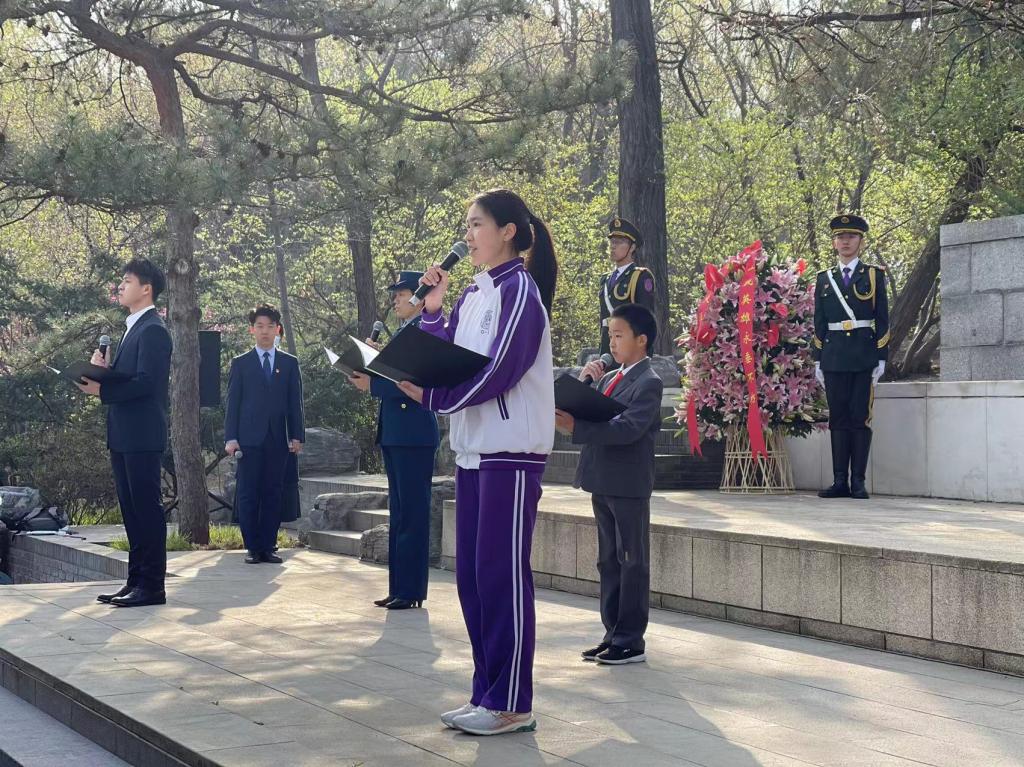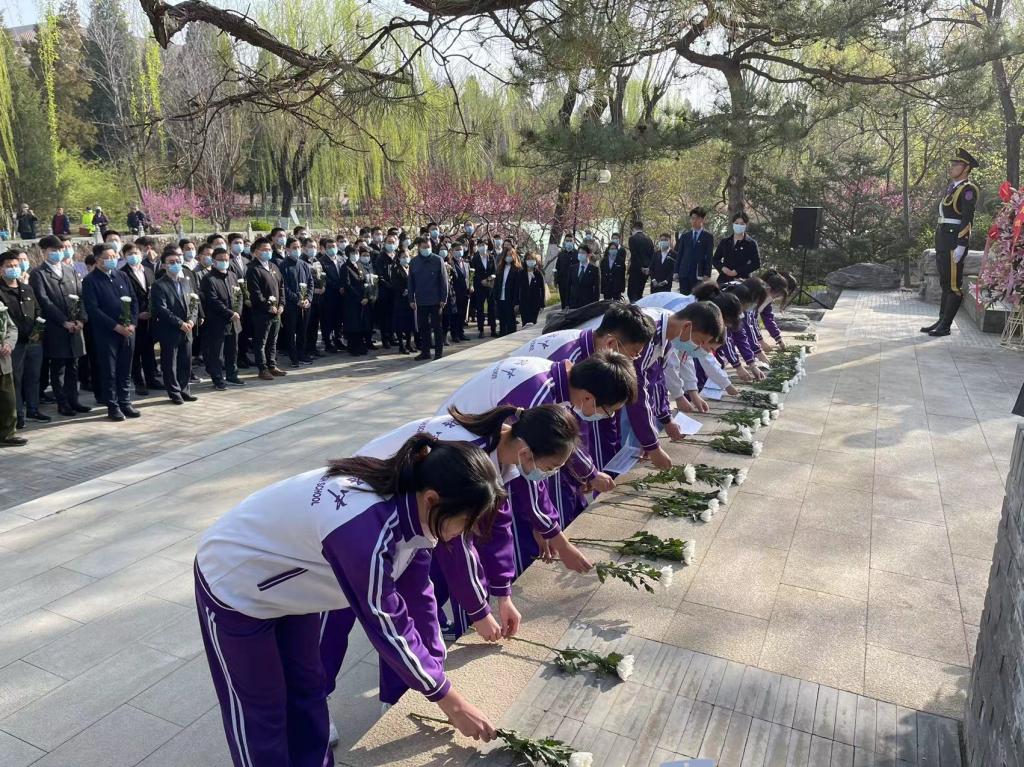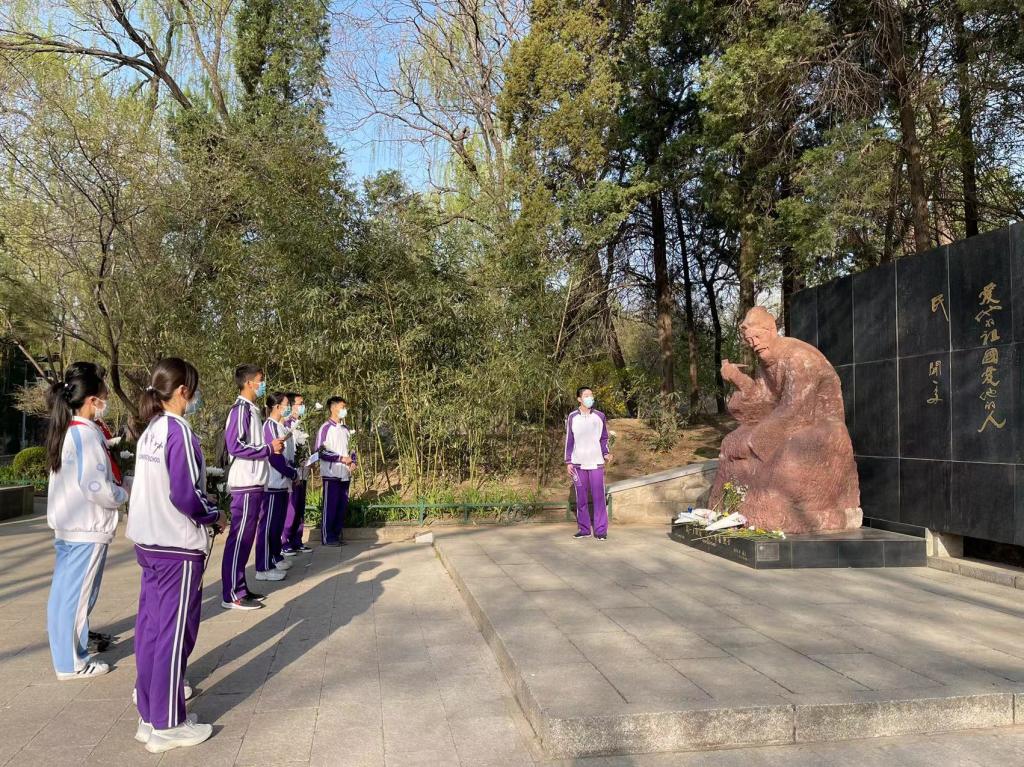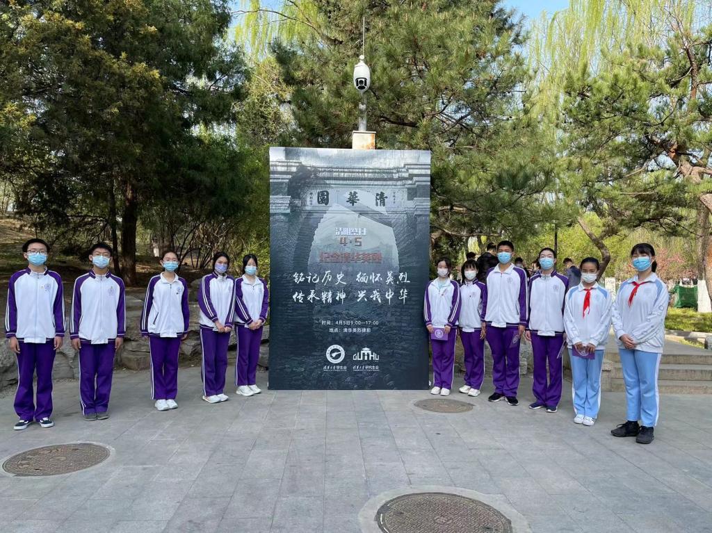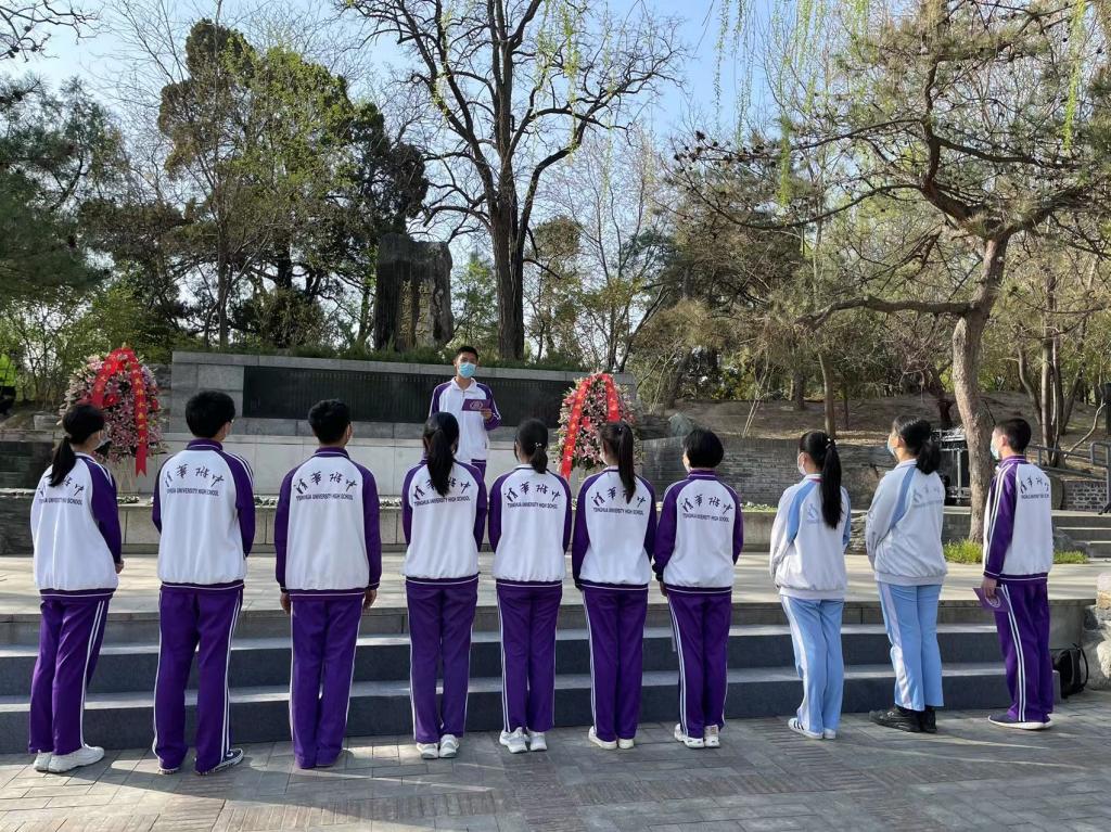 4月5日清晨,初高中11位学生代表参加了清华大学“祖国儿女 清华英烈” 祭扫活动,全体师生手持黄白菊花,低头静立,向为民族解放和人民革命事业英勇献身的清华革命先烈默哀。祭扫仪式上,学生代表朗诵了诗篇《英雄祭》,在清华园里的烈士纪念碑前进行了事迹宣讲,缅怀革命先辈。