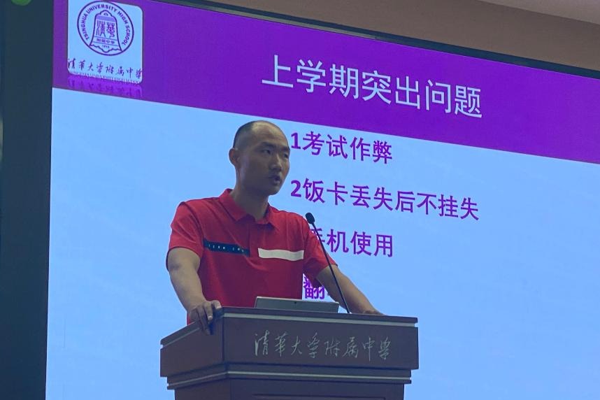 学生发展中心王鹏老师为同学们进行学校纪律卫生方面的重点提醒,他提出上一学期同学们的不足并呼吁大家在新的学期予以改进,同时再次明确了奖惩机制,激励大家尽自己所能让附中的美与各位同学有关。