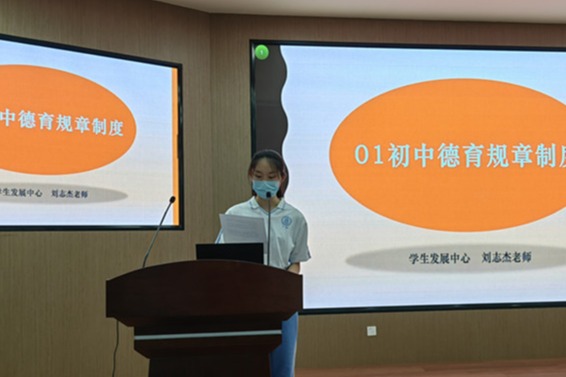 初中会场,学生发展中心刘志杰老师就初中德育规章制度内容重点向初一新生介绍附中的值周工作制度、晨检规章制度、课间操规章制度以及具有附中特色的水木行动。强调附中学生应遵守校纪校规,无特殊原因不迟到,有自己的责任与担当。