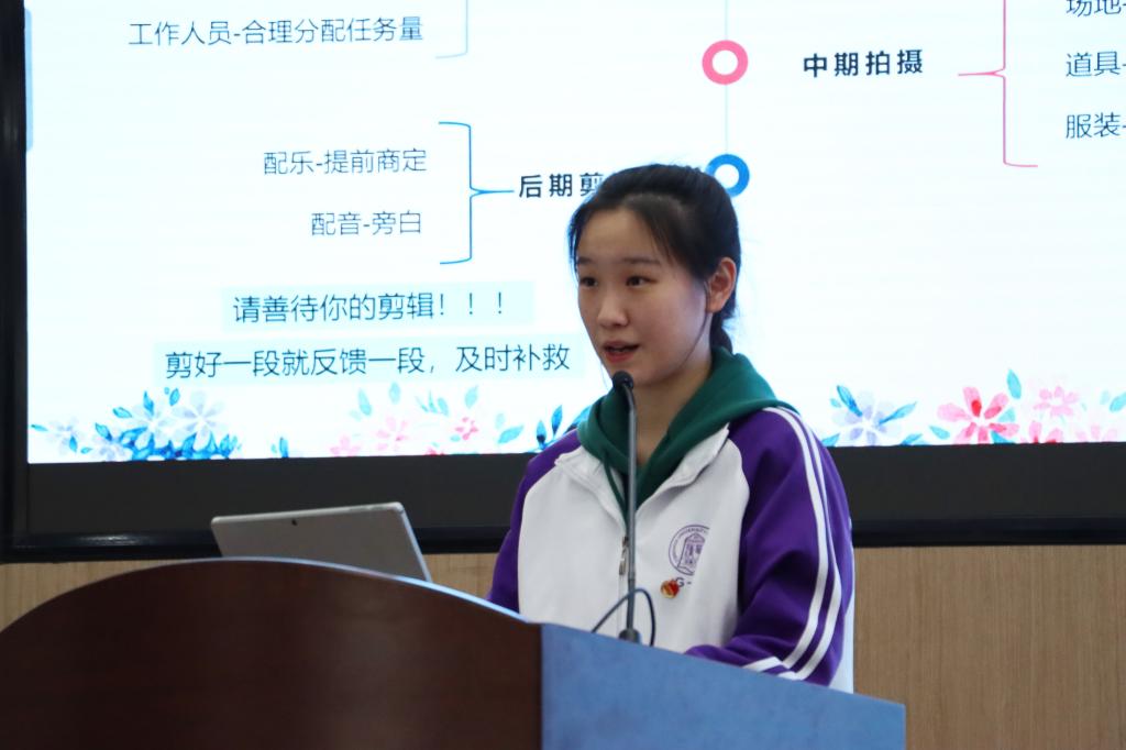 高2114班王雪莹同学对微电影制作全过程进行了全面概括,提醒同学们注意拍摄、整理素材和剪辑时的各种细节,强调了团队协调的重要性。拍摄微电影需要付出许多时间和精力,但最后的成品总会带来惊喜。