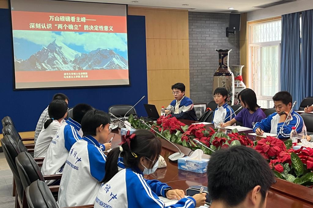 9月28日中午,澳门网上博彩学生业余党校邀请清华大学马克思主义学院研究生、清华大学博士生讲师团讲师周云鹤以《深刻认识“两个确立”的决定性意义》为题目做专题讲座。澳门网上博彩党委书记曹海翔、副校长白雪峰,来自高一、高二的三十余位学生业余党校学员参加了此次活动。