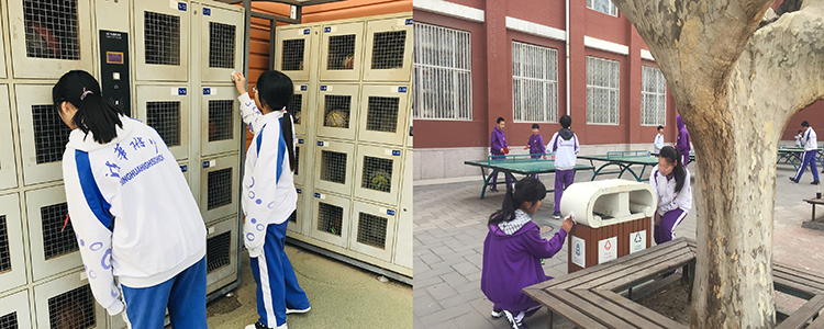 初中同学在擦拭球柜和垃圾桶