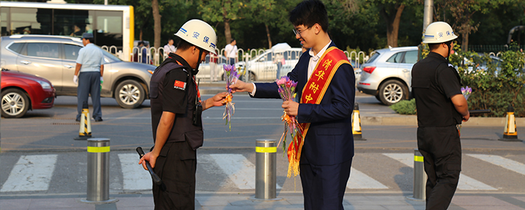 学生为保安叔叔献上鲜花