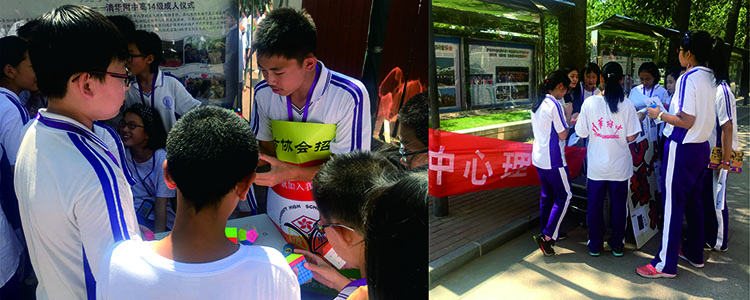9月7日中午,澳门网上博彩学生社团招新活动在A、C座教学楼之间和梧桐路上举办。本次社团招新活动分为高中社团和初中社团两个部分,共有近70个学生社团参与其中,类型涵盖自然科学与技术类、人文与社会科学类、体育与健康类等五大领域,吸引了近千名初高中学生咨询报名。