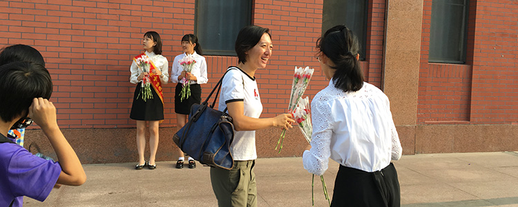 老师从学生手中接过鲜花