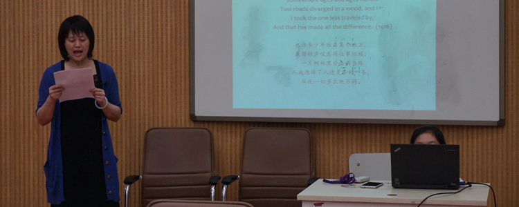 会上,三位老师与同学们分享了他们喜爱的诗作。同学们认真地聆听老师的智慧之言,时而屏息凝视,时而沉思。程惠云老师分享了美国诗人Robert Frost的英文诗作The Road Not Taken,勉励同学们勇于面对生活中的选择并掌控好自己的人生。