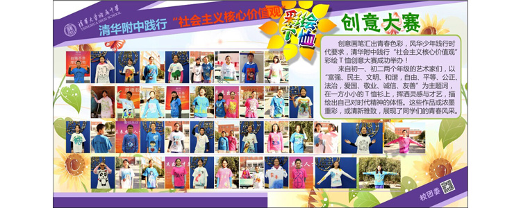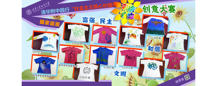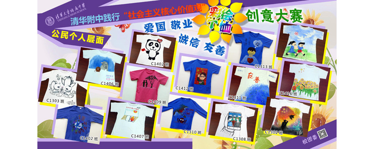 同学们以“富强、民主、文明、和谐,自由、平等、公正、法治,爱国、敬业、诚信、友善”为主题词,在一方小小的T恤衫上,挥洒灵感与才艺,描绘出自己对时代精神的体悟。作品中既有中国龙、熊猫、石狮子等传统中国符号,又有“神州”飞船等令当今中国人自豪的图像;既有简约抽象的当代艺术风格,又有漫画式的“呆萌”人物形象;画面或浓墨重彩,或清新雅致,但都展现了同学们的青春风采,以及对社会主义核心价值观的理解与追求。评比结束后,创作者们穿上自己的作品,合影留念。