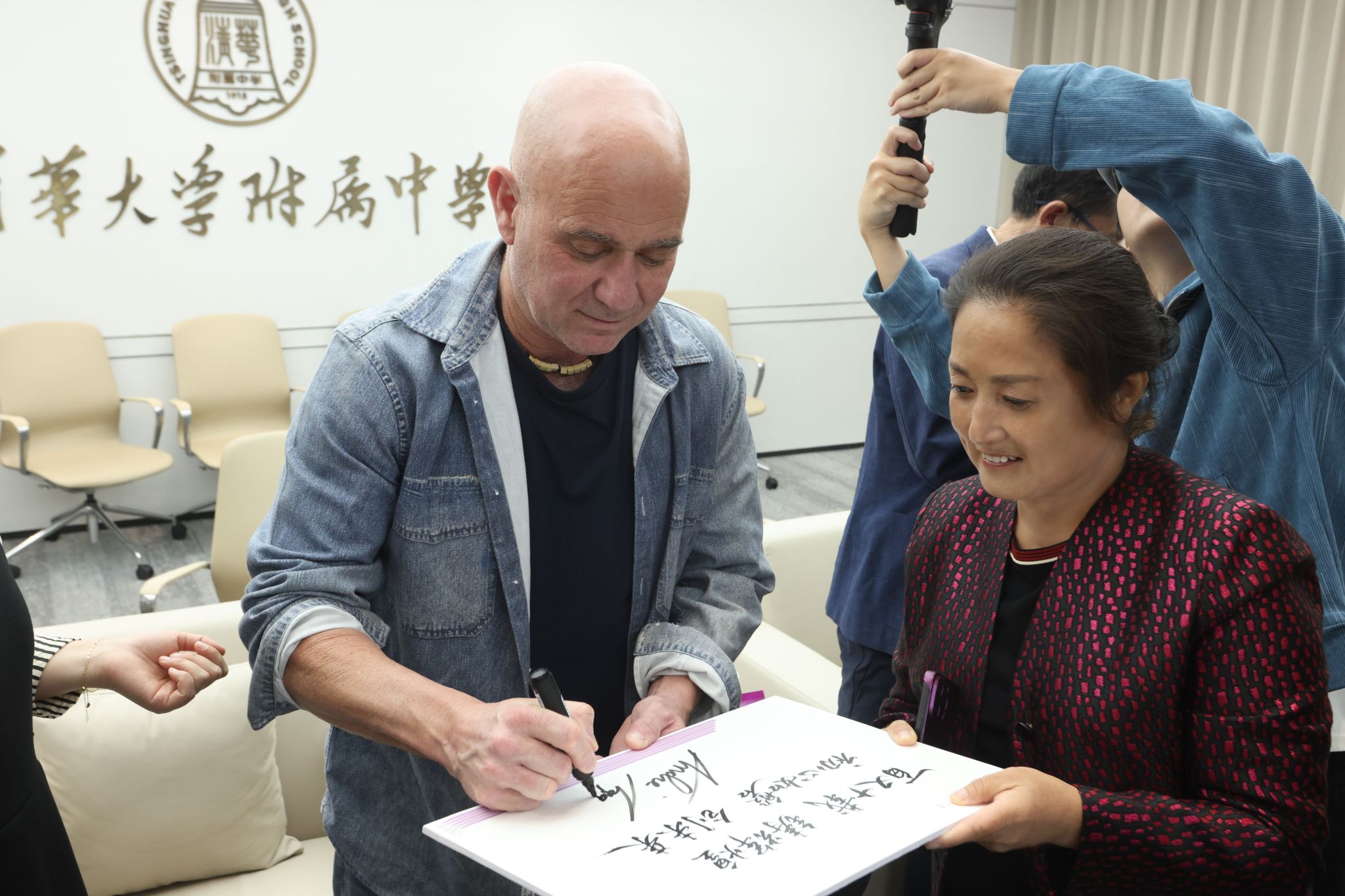 安德烈·阿加西、贾斯汀·吉梅尔斯托布与学生合影