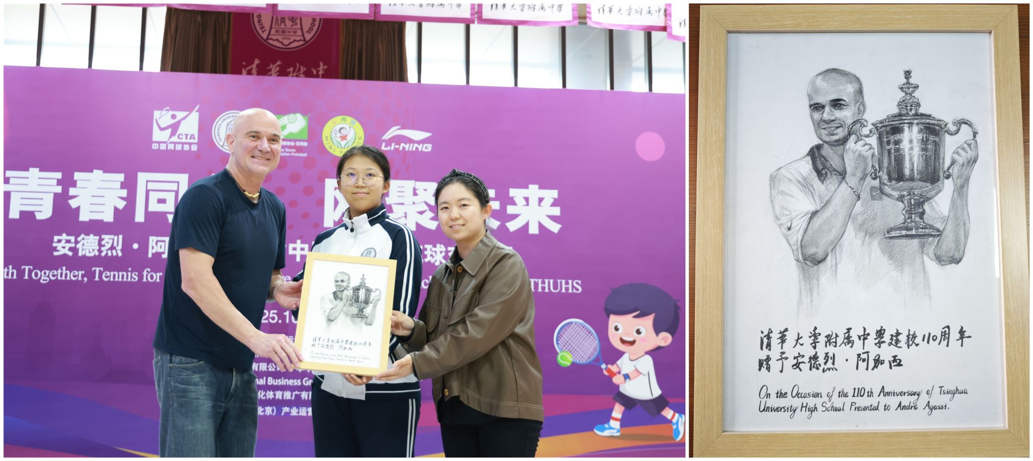 美术特长班同学为来访的阿加西运动员绘制的肖像画并将所绘肖像画作为校礼赠予外宾