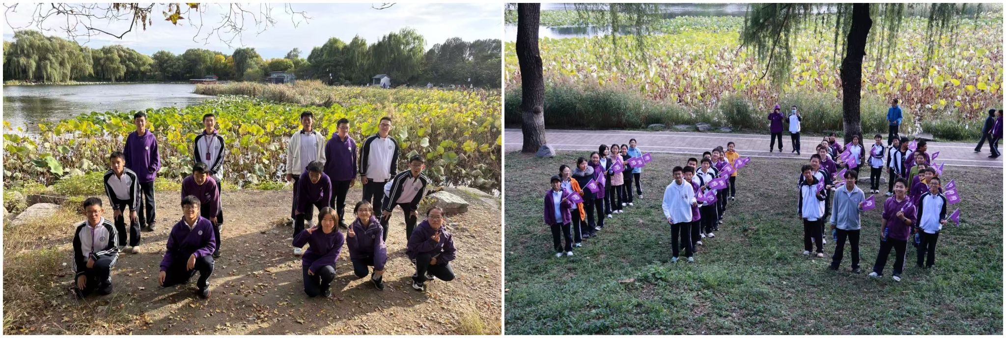 “西山脚下,圆明园旁。”10月17日下午,高25学部各班学子奔赴这座历史名园,在如画秋光中祝福母校。活动时,同学们在美丽秋景前录制饱含深情的祝福视频,句句真挚,情深意切;他们巧用缤纷落叶,在草地上拼贴出象征祝福的图案,将自然之美与人文之情巧妙融合;嘹亮激昂的校歌在园中回荡,歌声承载着学子们的骄傲与祝愿,飘向远方。这场融合了体育、自然与人文的活动,不仅锻炼了体魄,更凝聚了学子们对母校共同的赤子之心。