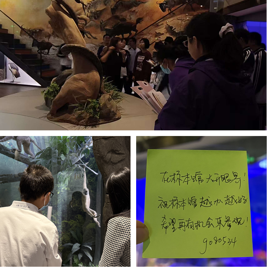 生物学科组织参观校标本馆、高2516班志愿者给校友讲解、校友参观标本馆后给母校留言给志愿者点赞