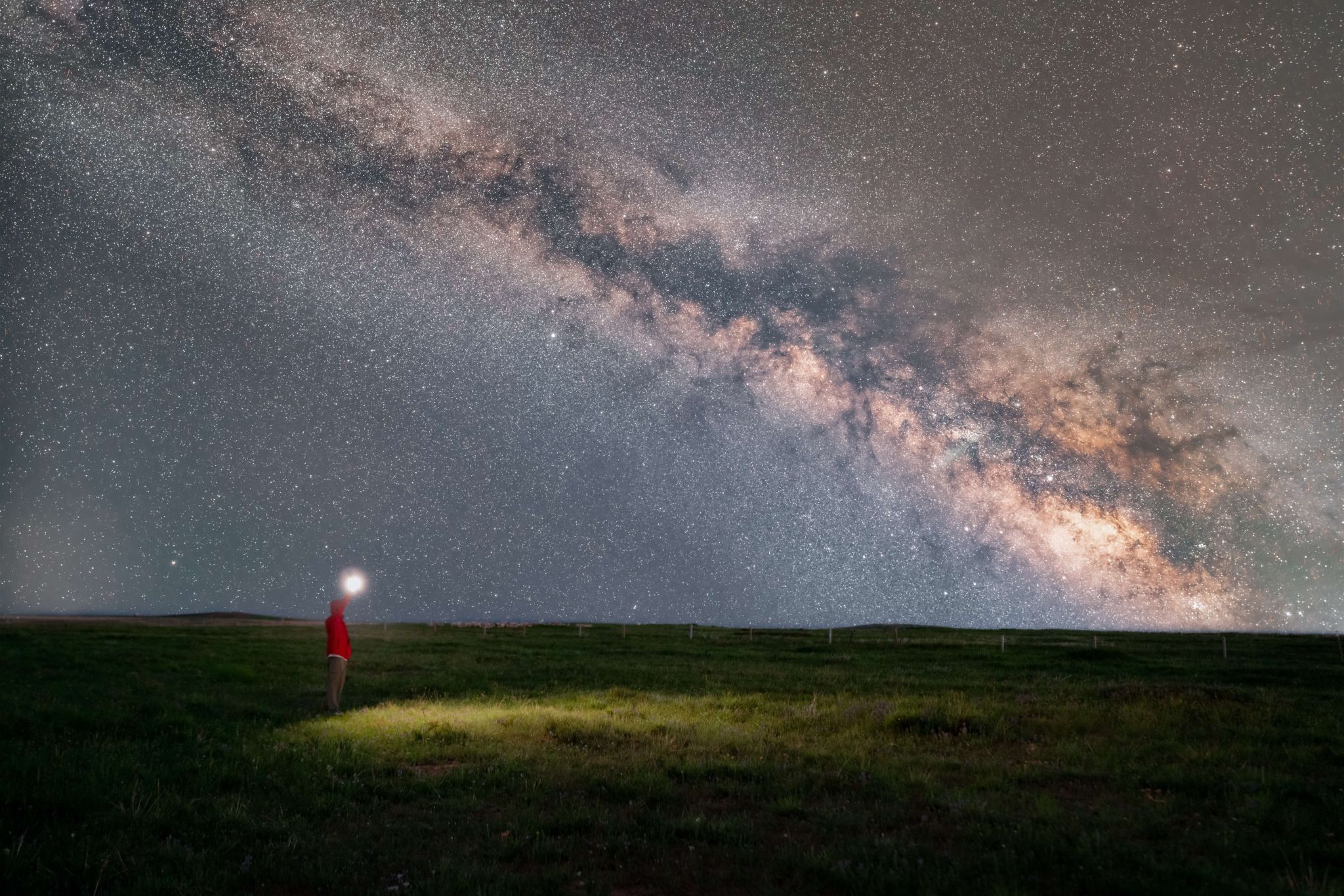 研学恰逢夏季银河观测季,夜幕垂落,草原如墨展向天际。这里远离光污染,洁净的大气让银河细节毕现:暗区是尘埃幽影,亮处是星团炽烈,每粒微光都来自光年外恒星的脉动,与星云交织在一起构成了如梦如幻的宇宙画卷。璀璨的银心散发着迷人光芒,穿越数万光年到达地球,条状光带也证明了地球位于具有盘状结构的银河系。人立天地间,方知地理书上“宇宙浩瀚”四字的重量。