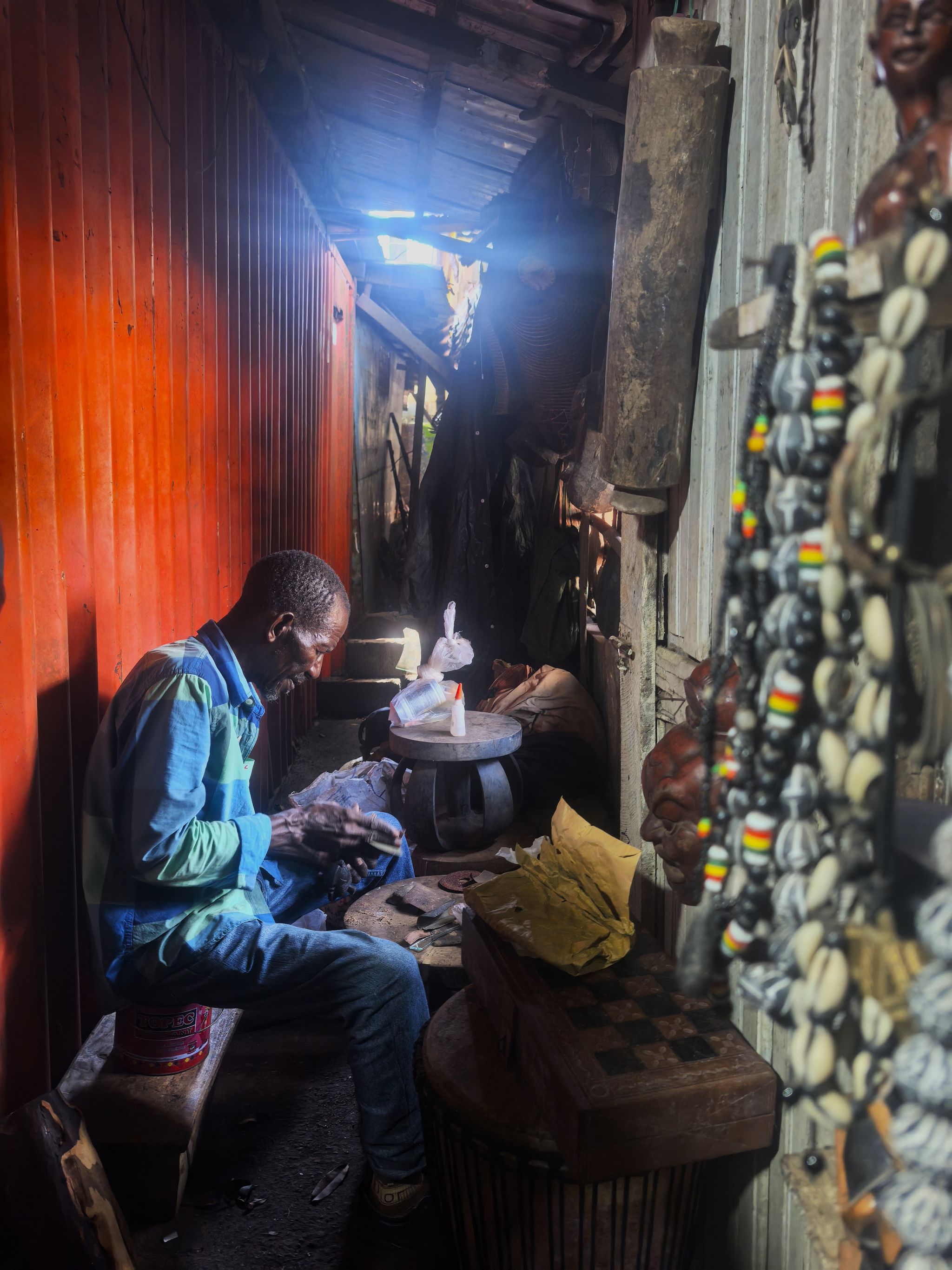 几内亚,位处西非,只有旱季和雨季,这里经济落后,但矿产丰富。其中铝矾土的储量世界第一。因交通不便,这里的旅游业并不发达,几乎没有游客,每年在旱季时候才会有一些矿产商人来这里。几内亚的雨季刚刚开始,偶尔还能见到太阳,难得有晴天。7月中旬,我去了这里唯一的手工艺市场,在父母和商贩讨价还价时,我发现这位老人在狭窄的夹缝里专注地工作着,对我们这群吵闹的外地人完全没有注意。这一瞬间,我觉得时光停止了,悄悄拿镜头记录下他专注的样子,这份精神,本就是一座雕塑。