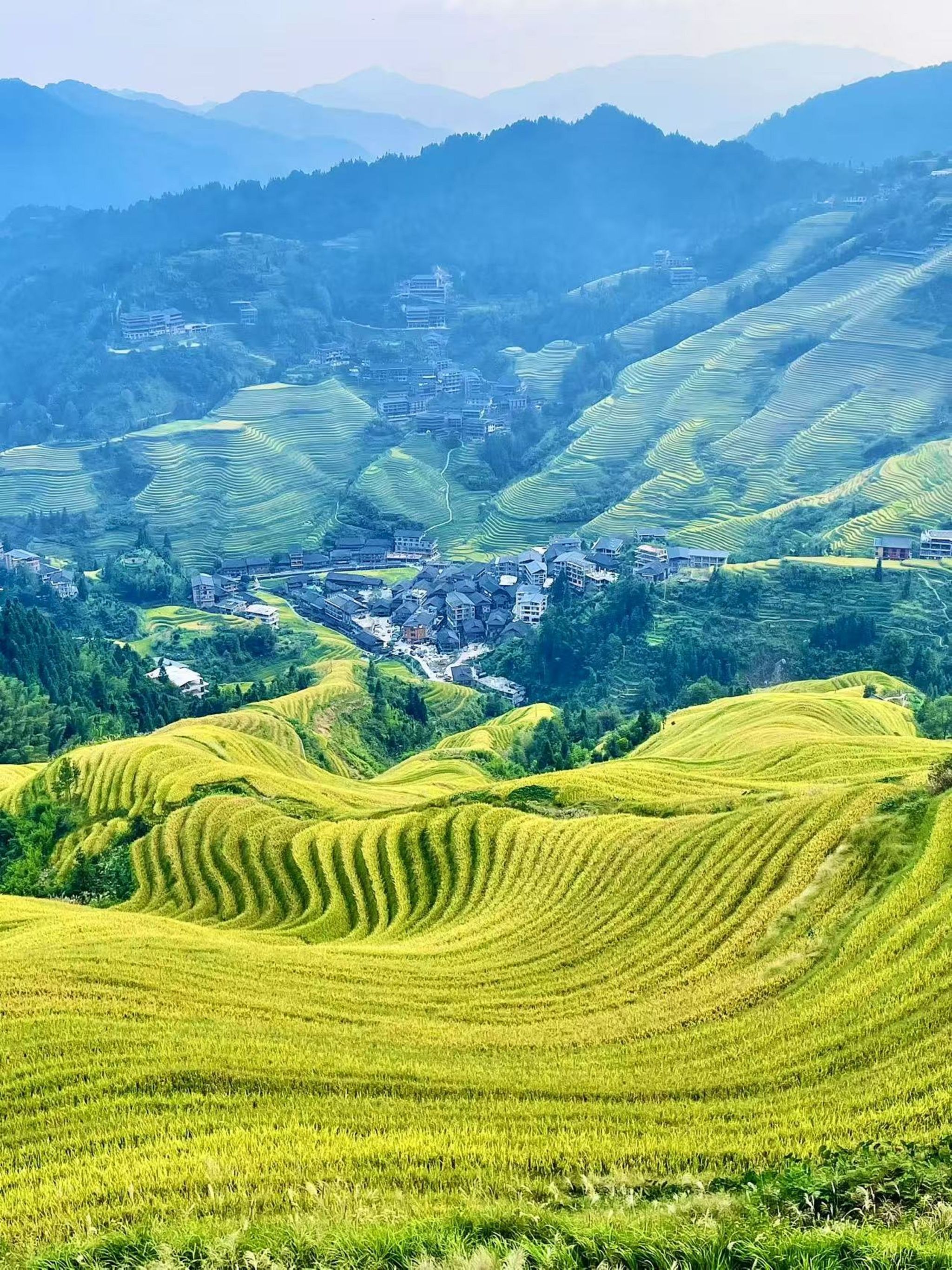 早晨7:40,我来到广西龙胜龙脊梯田观景台。金秋十月,恰逢梯田粳稻成熟,梯田金黄色的层层粳稻犹如雄浑翻腾的海浪。龙脊梯田,被誉为“世界梯田原乡”,海拔落差380米-1180米。该地区的人民早在秦汉时期便开始梯田耕作,至唐宋已成规模,明清时期形成当今的样貌。龙脊梯田核心区的自然风光与人工奇迹交相辉映,层层画面描绘着南岭人民适应自然、改造自然、敬畏自然的壮美画卷。我不由赞叹,南岭人民千年生活的朴实与艰辛,感悟华夏民族生存智慧的生生不息。