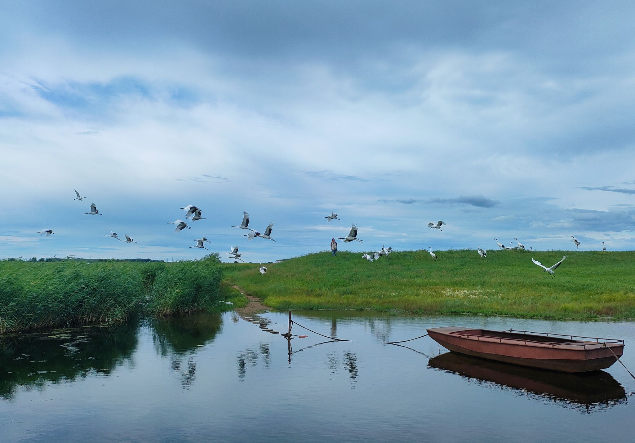 下午的黑龙江齐齐哈尔市扎龙自然保护区,丹顶鹤们,群起而飞。这里,是世界级湿地,生命的摇篮,地势低洼,河曲发达,芦苇荡、湖泊、沼泽众多,形成了独特的生态系统。这里人与自然和谐共生,保护着生物的多样性。每年春季,鹤群迁徙至此,繁衍生息,秋季又会飞往南方,生命在这里绽放光芒,生生不息。照片将扬起翅膀、肆意飞翔的丹顶鹤定格下来,此时水、船、草、鸟、人相互呼应,体现着人地和谐的生态之美。