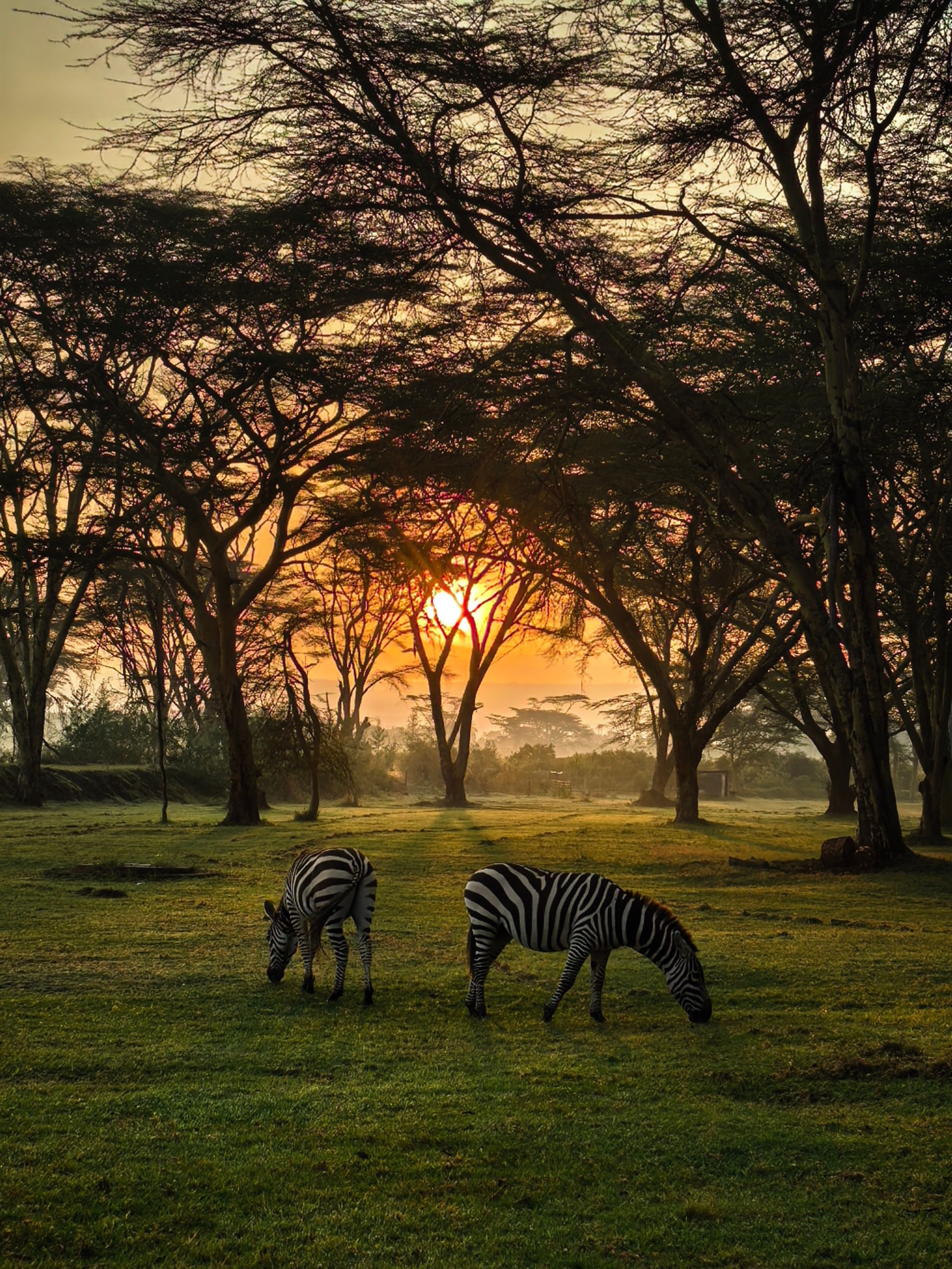 早晨6点45分,东非大裂谷的纳库鲁湖岸,清晨漫染,暖黄光线穿透稀疏散生的金合欢树缝隙--这是植被适应干旱气候的标志。晨雾因裂谷低洼地形与温差在空中凝结成柔纱,四处飘着晨露浸润的草木气息。高大金合欢虬曲枝干如天然画框,其根系固着火山成因的碱性土壤。湖边草地上,两只斑马悠然觅食,黑白条纹在晨光中明暗交错。板块拉伸形成的纳库鲁盐水湖,便是这些生灵的天然庇护所。照片以树木为背景、斑马为焦点,定格裂谷生态链的自然和谐。
