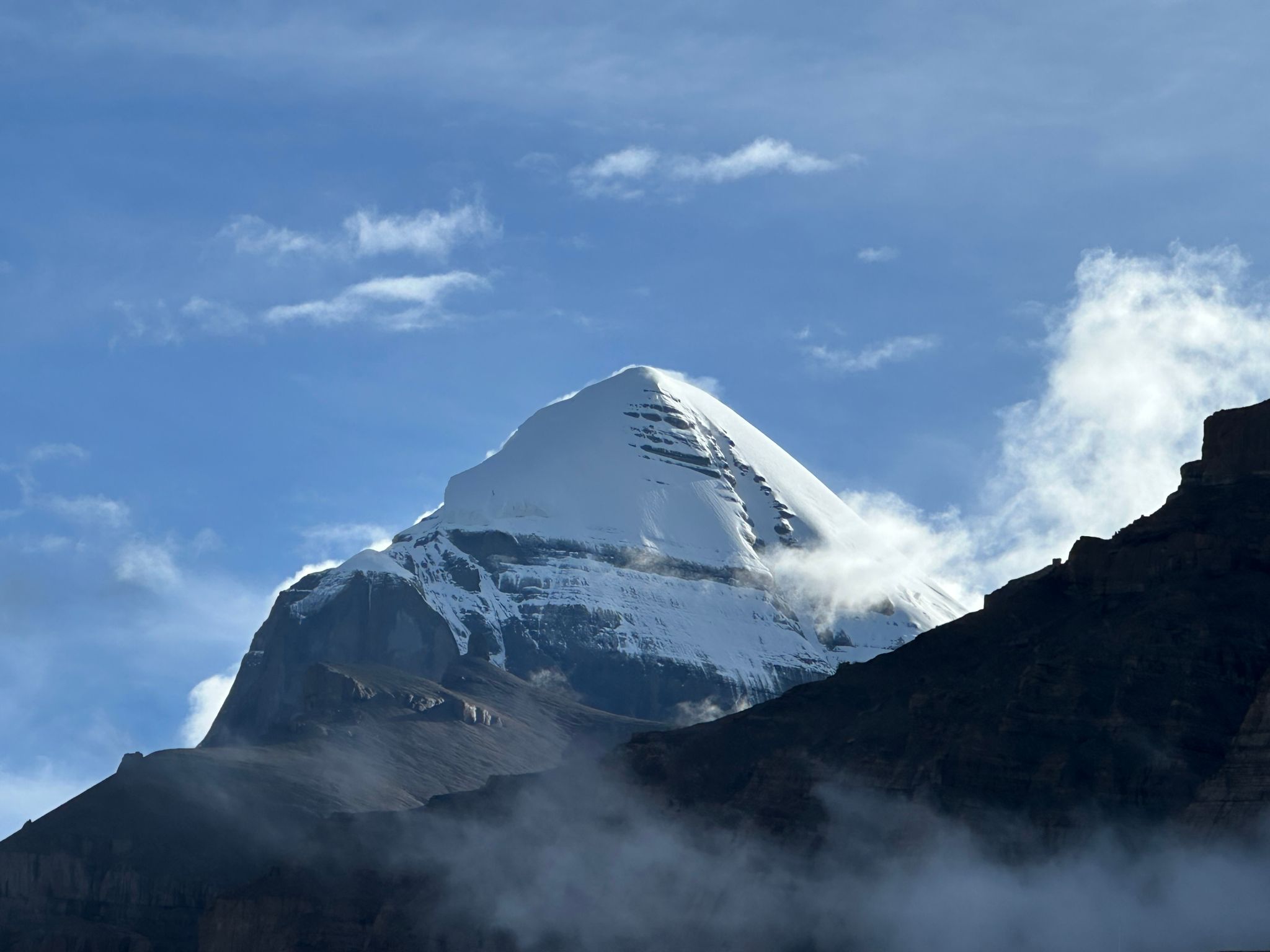 清晨的阿里普兰县冈仁波齐经幡广场,冈仁波齐峰迎来了日出。6656米的主峰如金字塔般规整,四壁对称,顶覆积雪冰川,透过薄云的逆光给山峰镶了一层金边。这座被誉为“神山之王”的高峰,有着近乎完美的地质形态——四棱锥体如金塔,四壁对称光滑,山顶终年被积雪与冰川覆盖,在阳光下泛着凛冽的银光。其地质身世藏着板块运动的历史:印度板块与欧亚板块剧烈碰撞、挤压、隆起,多次冰川活动的改造,最终塑造出这座“神山”。照片以长焦定格,日出时分的神山轮廓,浮云飘出,神秘万分,这里隆起的每块岩石,都藏着地层脉动的历史。