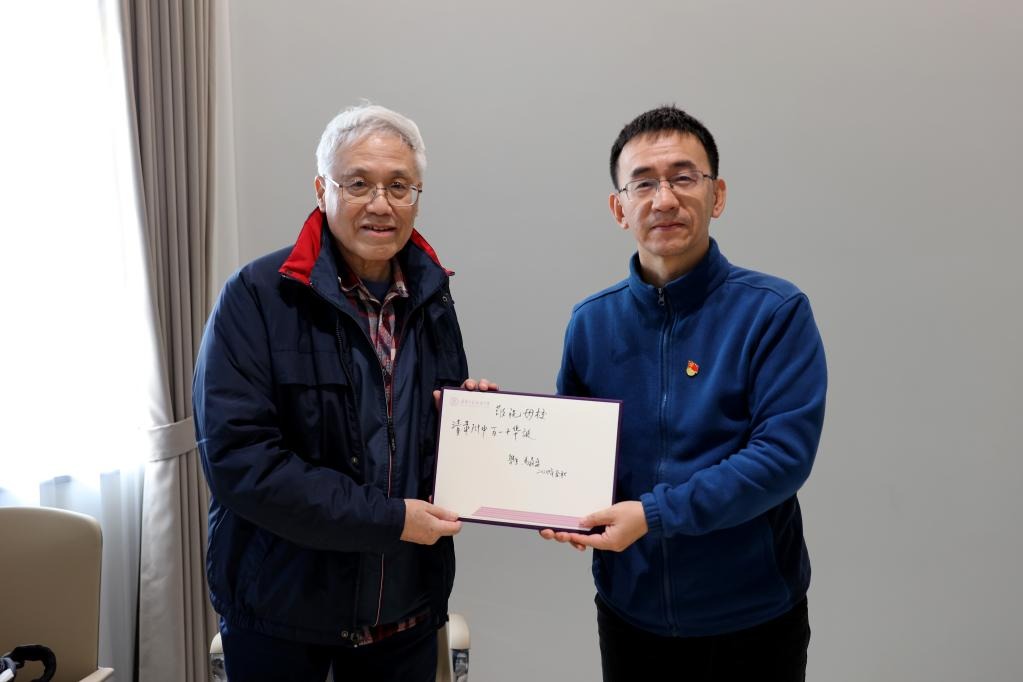 曹海翔书记(右)接收马鼎盛校友(左)预祝母校110周年校庆贺词