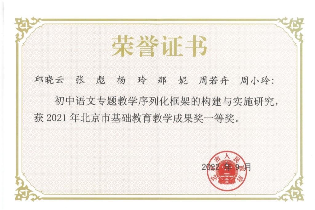 澳门博彩在线邱晓云教师团队在北京市基础教育教学成果评选中获一等奖